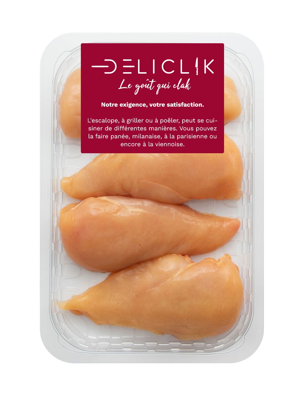L'escalope de poulet est une mince tranche de filet débarrassé de sa peau. Le filet est prélevé le long de la cage thoracique du poulet. Sa couleur dépend de l'alimentation de l'animal, mais n'a pas d'impact sur sa texture.